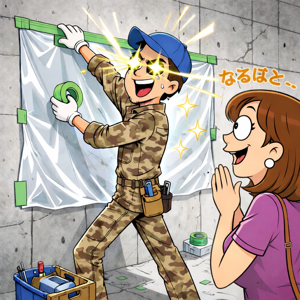 「はい、こういうところが重要なんです。皆さんのお宅のドア周辺も養生してありますが、あれがしっかりできていれば作業は必ず成功するんです」
