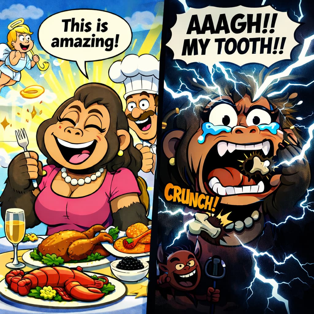 まさに「天国と地獄」を同時に味わう・・おっと、対象が料理なだけにちょうどいい掛詞(かけことば)となってしまったが、これまでの食事制限の反動もあり、一心不乱に料理へ箸を伸ばすわたしは、飛び上がるほどの激痛と共に「ゴキッ」という鈍い破砕音を耳にしたのである——あ、これはやっちまったな。